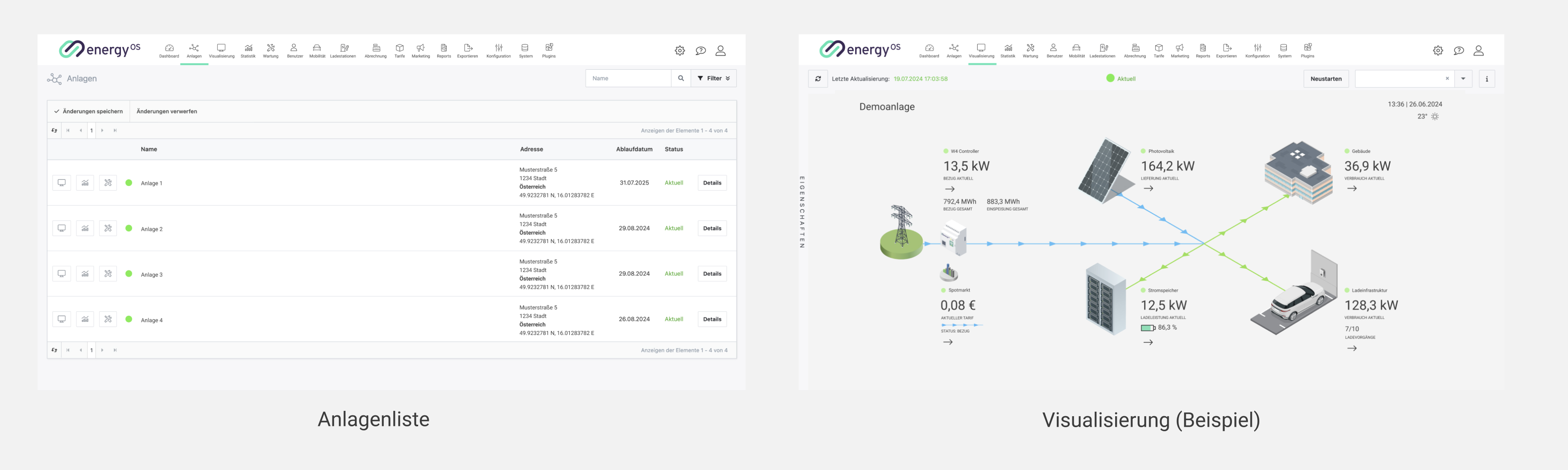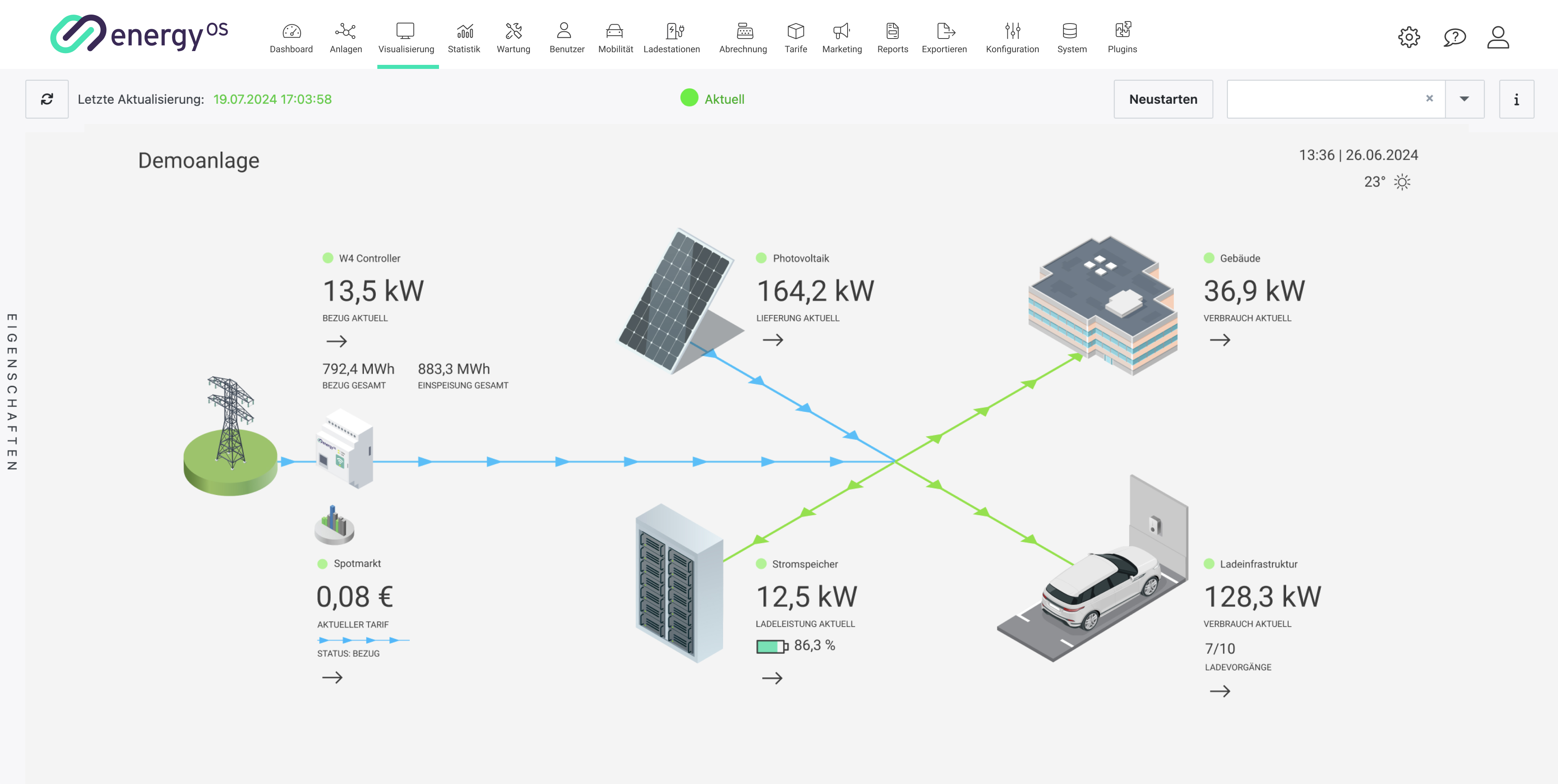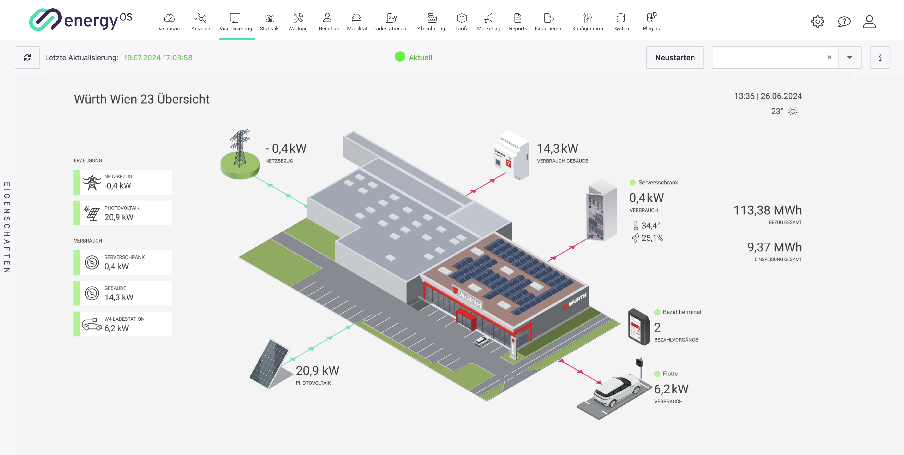 Je nachdem, welche Anlage Sie in der Anlagenliste ausgewählt haben, gelangen Sie über den Hauptmenüpunkt “Visualisierung” zu der Visualisierung der Anlage.