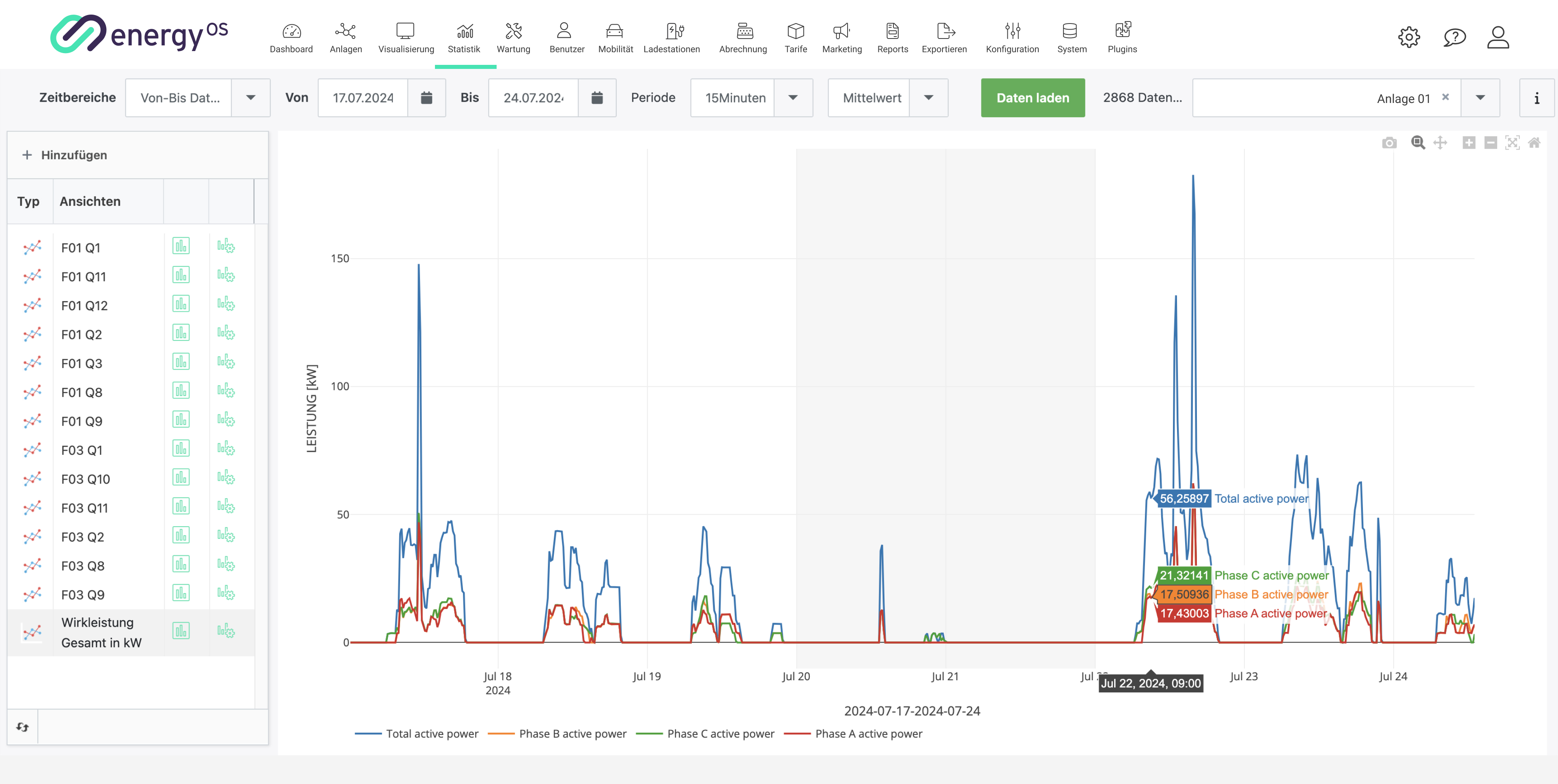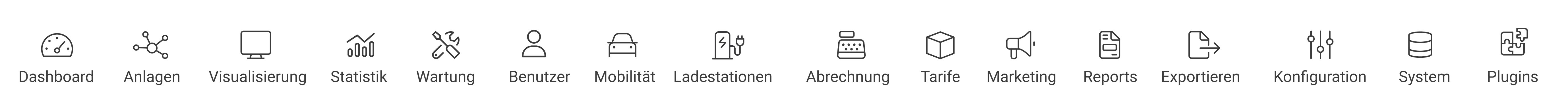 Die Punkte im Hauptmenü beziehen sich systemweit auf alle eingebundenen Anlagen – mit Ausnahme von ‚Visualisierung‘ und ‚Statistik‘. Um diese Funktionen nutzen zu können, muss zunächst eine spezifische Anlage aus der Anlagenliste ausgewählt werden.