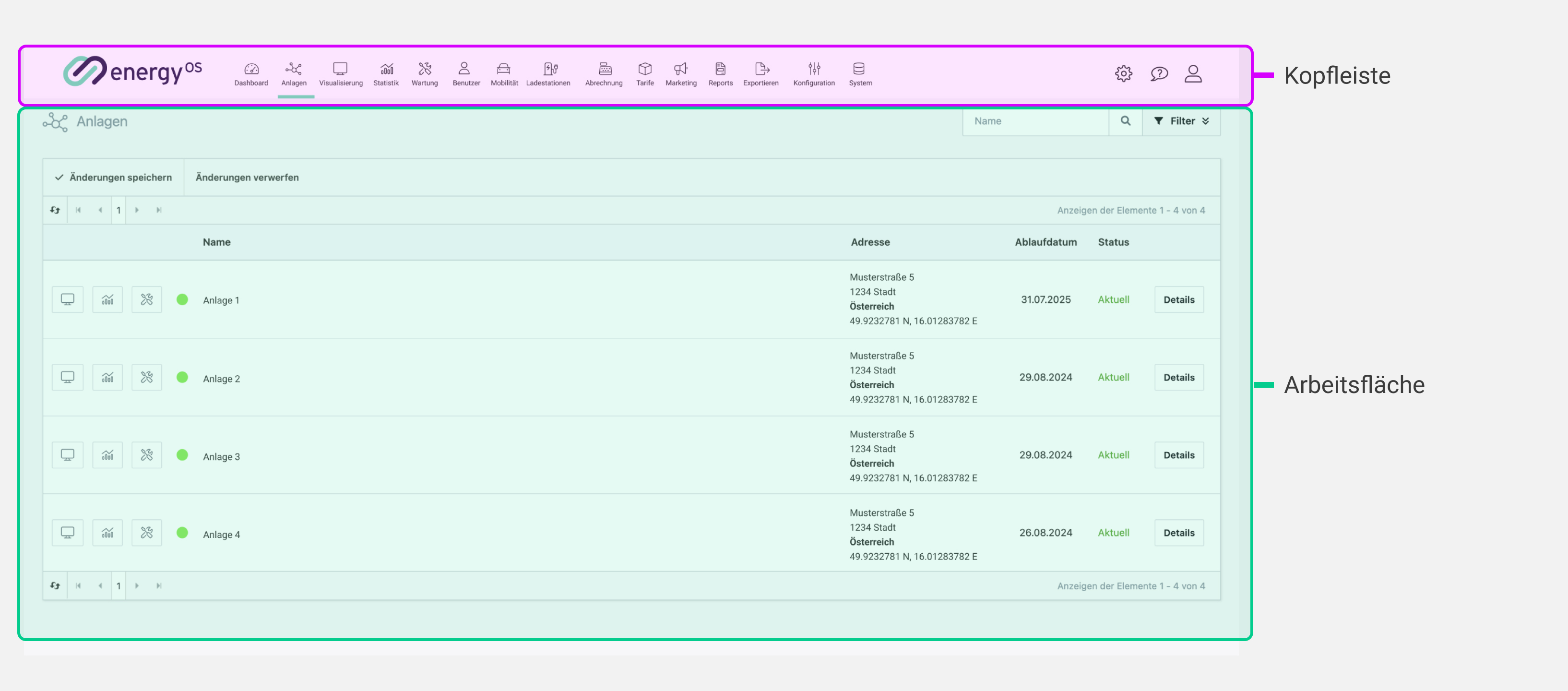 Die Kopfleiste dient der Navigation innerhalb der Bereiche. Ganz links befindet sich das Logo. Der Klick auf das Logo führt Sie zur Anlagenliste. Rechts vom Logo ist das Hauptmenü. Es enthält die Navigation zu den unterschiedlichen Bereichen der Plattform. Ganz rechts befinden sich diverse Einstellungen für das System, Spracheinstellungen und das Benutzerkonto mit Log-out.