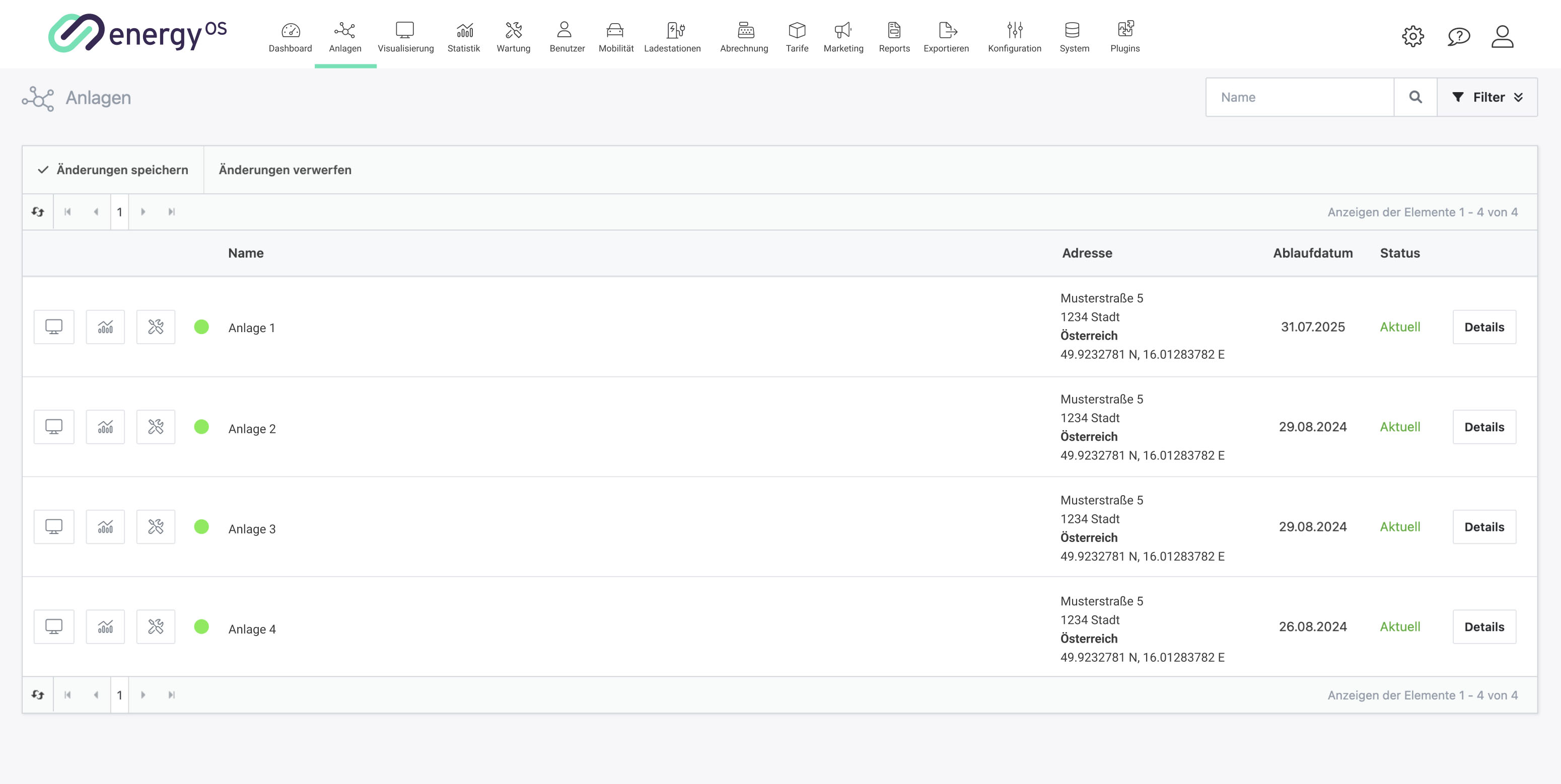Beim Einstieg auf die Plattform befindet man sich im ersten Punkt des Hauptmenüs „Anlagen“. Eine Anlagenliste Falls Sie mehrere Anlagen haben, wird beim ersten Login eine Liste der Anlagen angezeigt. Bei nur einer Anlage sehen Sie direkt die Visualisierung.