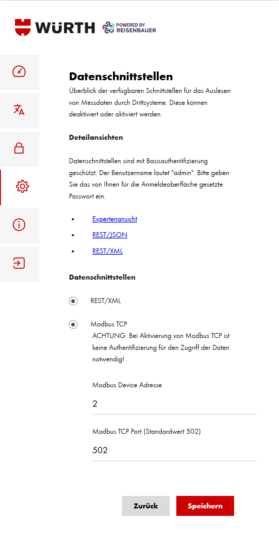 Navigieren Sie nach dem Setup zu Einstellungen / Datenschnittstellen. Aktivieren Sie Modbus TCP und stellen Sie die Modbus Device Adresse je nach der Anzahl der vorhandenen Würth Zähler ein, wobei die Adresse 1 für den EM Controller reserviert ist (d.h. Würth Zähler 1 = Adresse 2, Würth Zähler 2 = Adresse 3, etc.). Der Modbus TCP Port muss 502 sein (Standardwert)