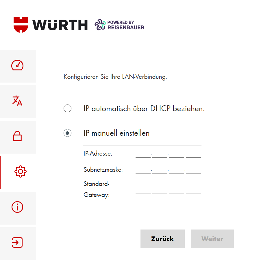 Klicken Sie auf „Jetzt einrichten“. Geben Sie das Initialpasswort 123 ein und legen Sie anschließend ein eigenes Passwort fest. Folgen Sie den Anweisungen auf dem Bildschirm, um den Würth Zähler vollständig zu konfigurieren. Vergeben Sie beim Setup eine statische IP Adresse.