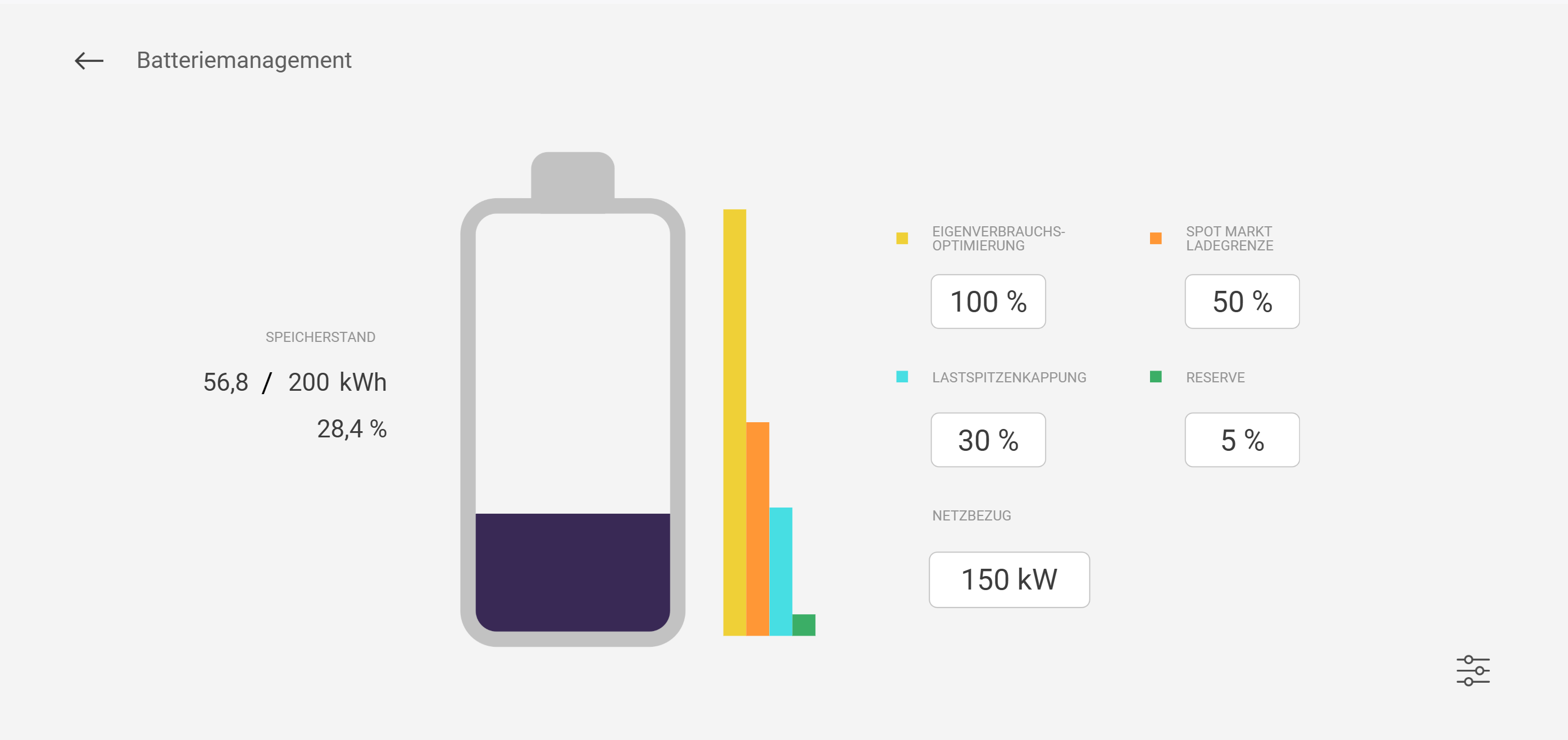 Nach der Spitzenzeit wird der Speicher wieder geladen, wenn die Netzbezug geringer ist. So entsteht ein gleichmäßigerer Leistungsbedarf und eine Reduzierung der Energiekosten.