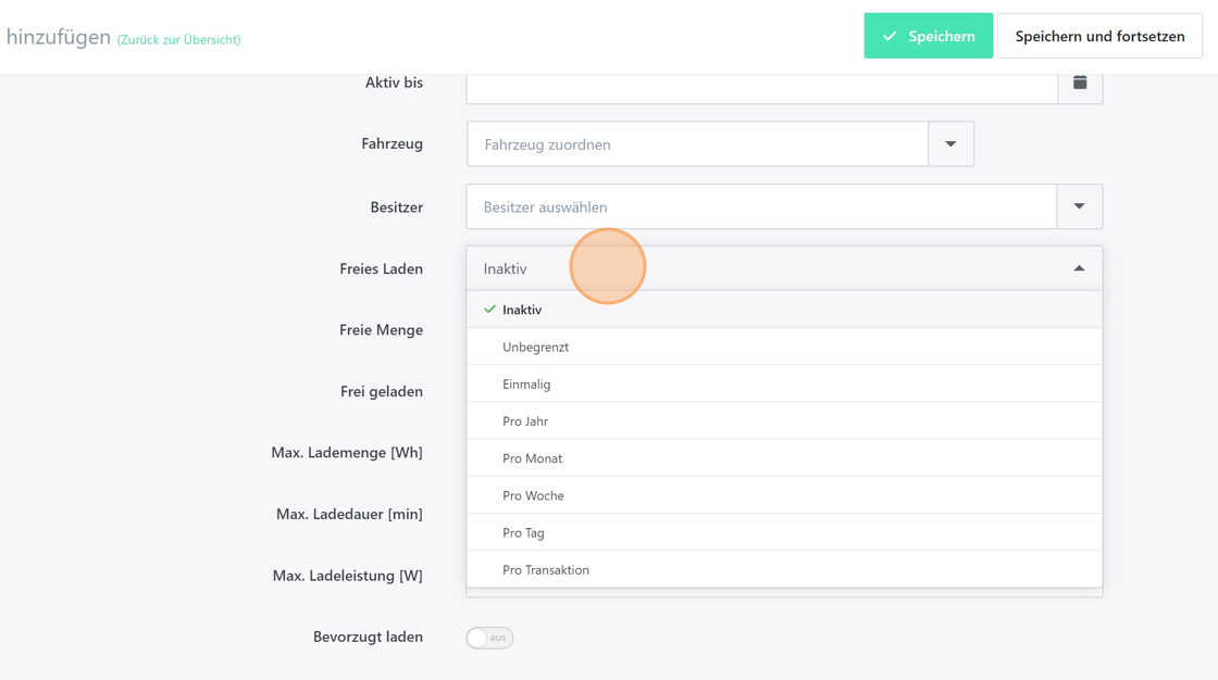 12. Über "Freies Laden" können Sie festlegen, dass mit einer Karte kostenlos an einer Ladestation geladen werden kann.